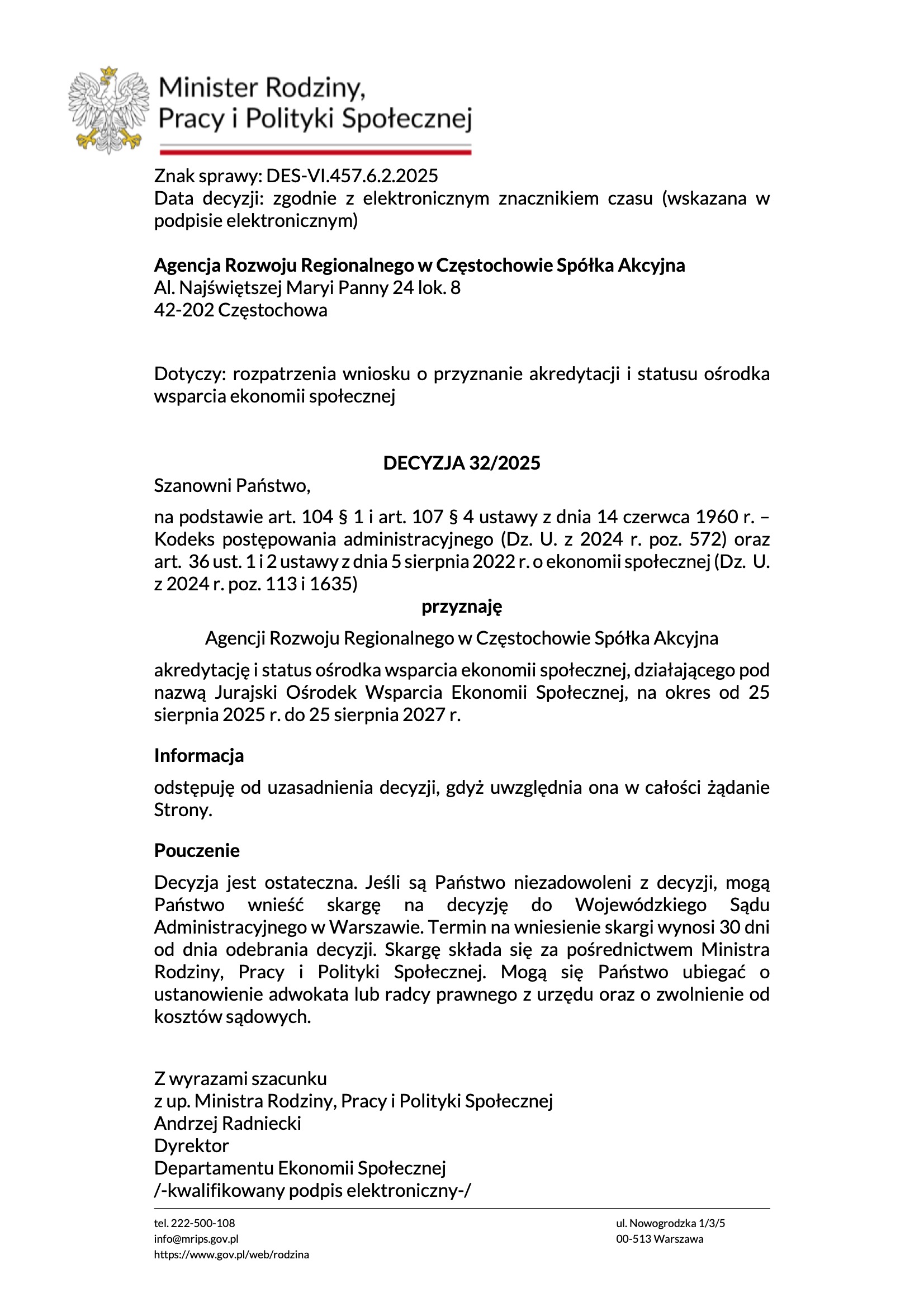 2. Uzyskanie statusu przedsiębiorstwa społecznego najpóźniej do 6 miesięcy od momentu utworzenia miejsc pracy.